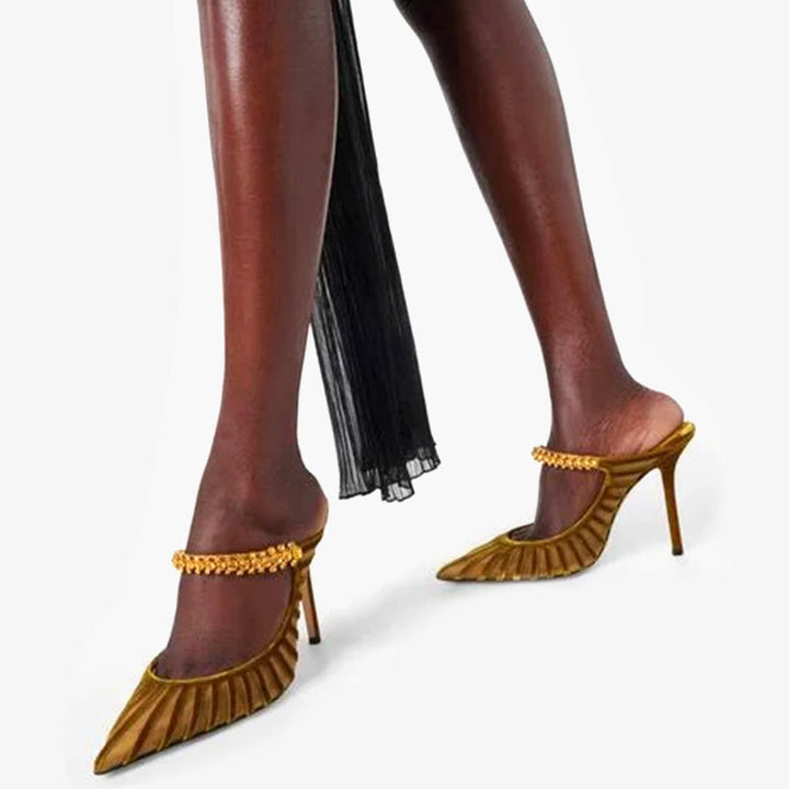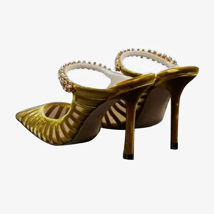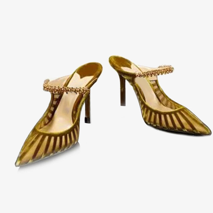 These pointed-toe mules feature a velvet and mesh upper with delicate embellishments, fabric lining, and a leather insole and sole for a refined finish.